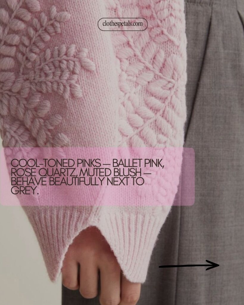 Cool-toned pinks — ballet pink, rose quartz, muted blush — behave beautifully next to grey.