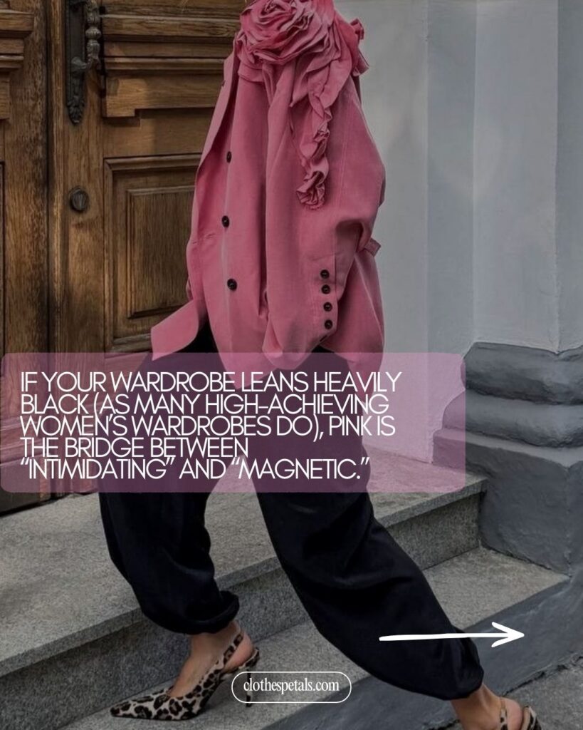 If your wardrobe leans heavily black (as many high-achieving women’s wardrobes do), pink is the bridge between “intimidating” and “magnetic.”